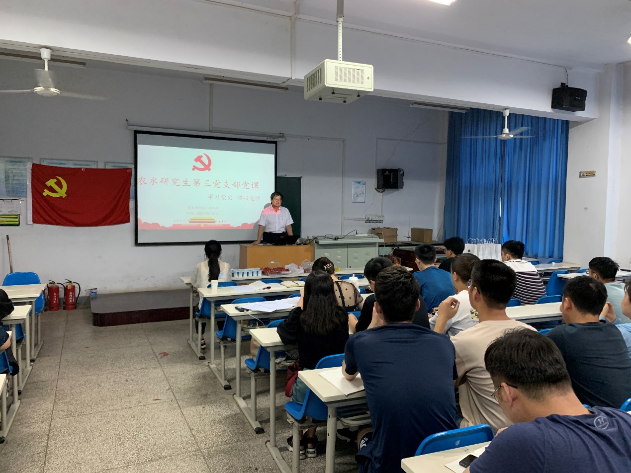 为加强四史学习教育,坚定四个自信,提高学生党员的思想政治理论水平,增强学生党支部凝聚力,6月21日晚,农水研究生第三党支部于5120教室开展书记讲党课暨毕业生党员欢送会,此次会议由支部书记胡笑涛主持并带领学习,农水研究生第三党支部全体党员参会。