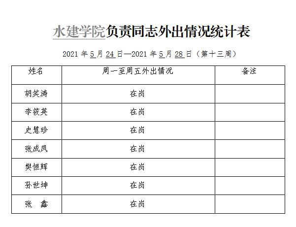 » 小宝探花 负责同志外出情况统计表(第十三周)