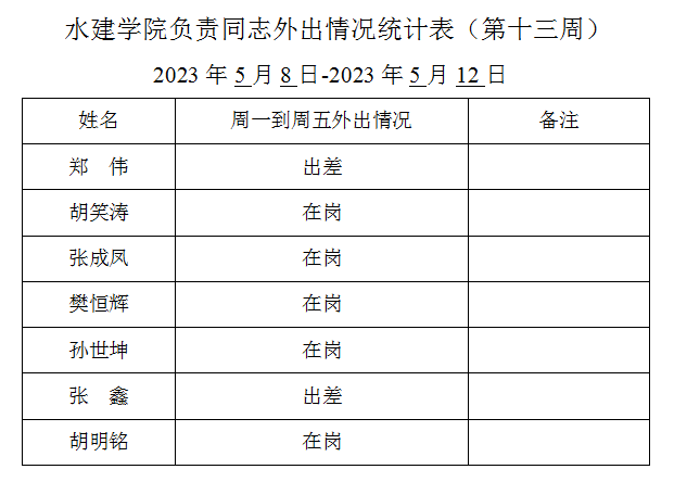 » 小宝探花 负责同志外出情况统计表(第十三周)