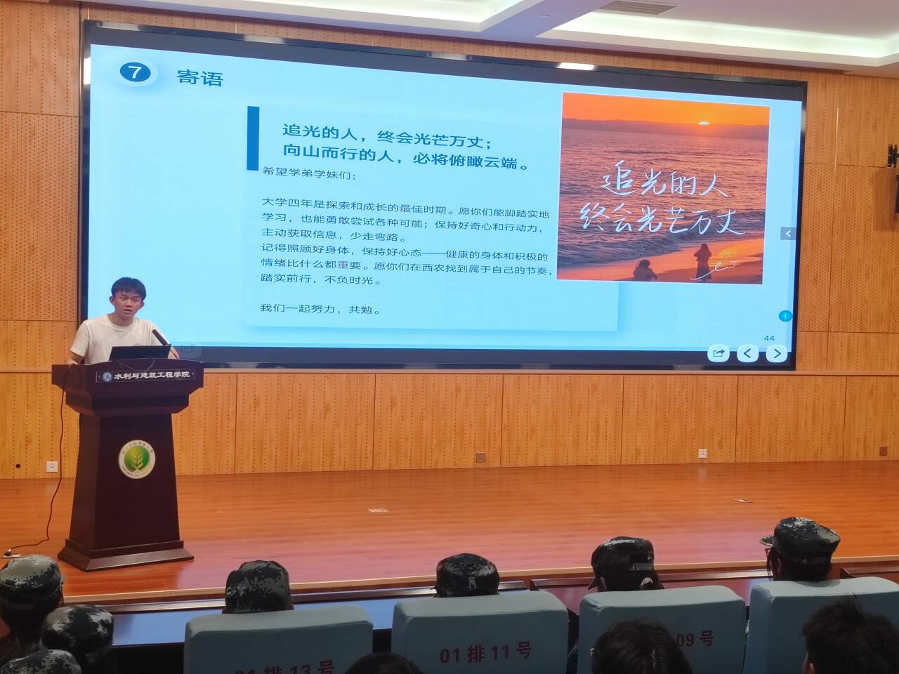 会议由孟庆涛副书记主持。活动伊始,肖志成学长以“一直往前走,能看到更好的风景”为主题,结合自身成长历程,向新生们分享学习方法,将本科阶段的宝贵经验倾囊相授,为新生们送上了满满的“成长干货”。面对肖学长的真诚分享,新生们神情专注,时而凝神倾听,时而频频点头回应,听到实用建议便立即认真记录,展现出强烈的求知热情。