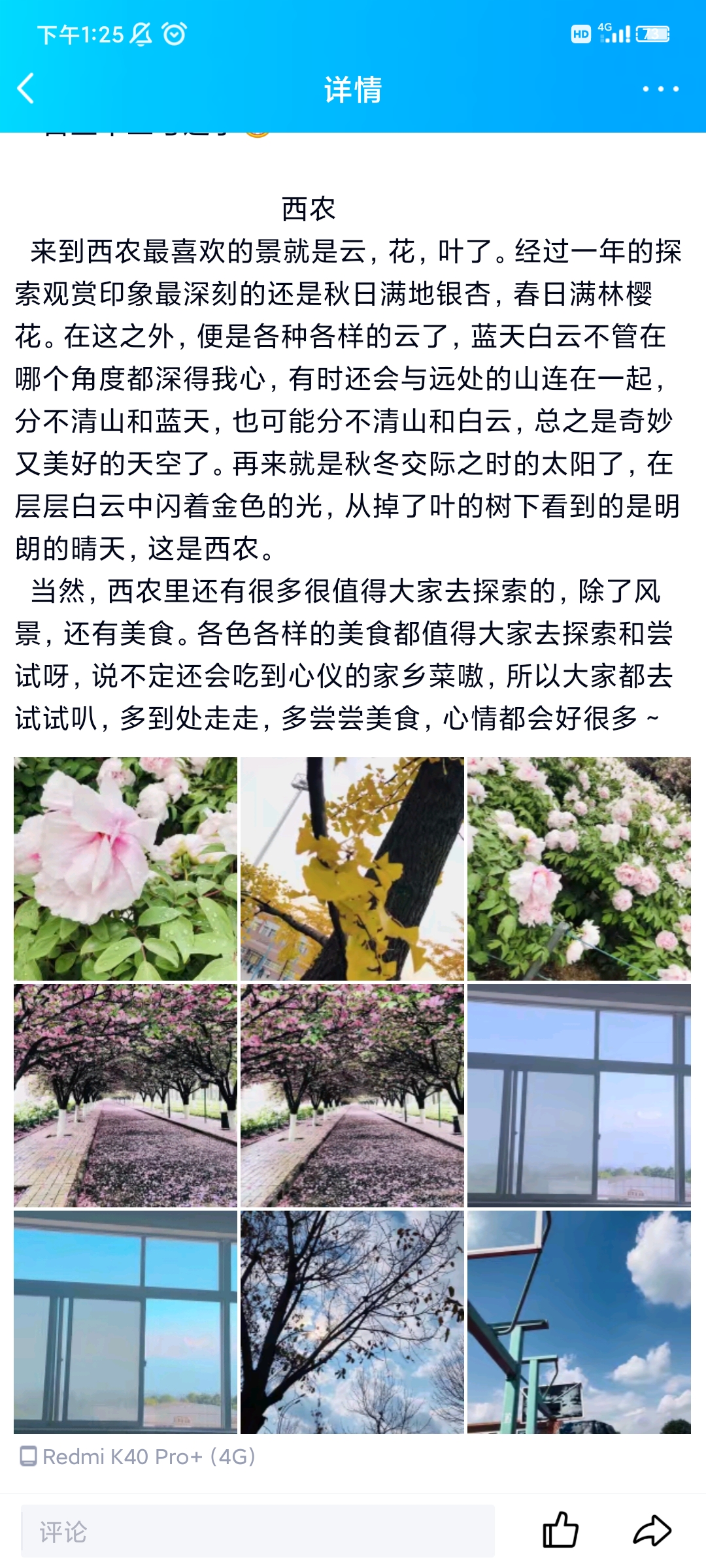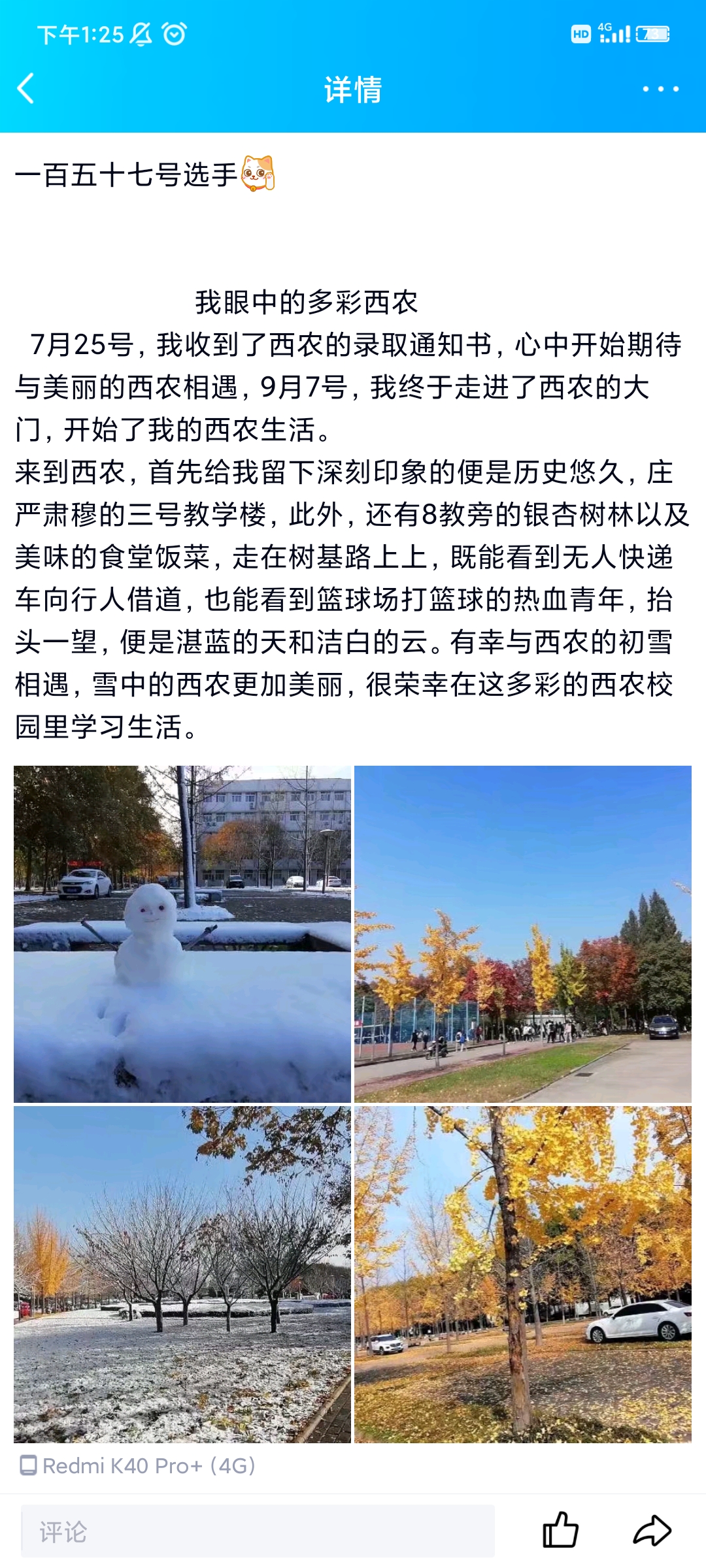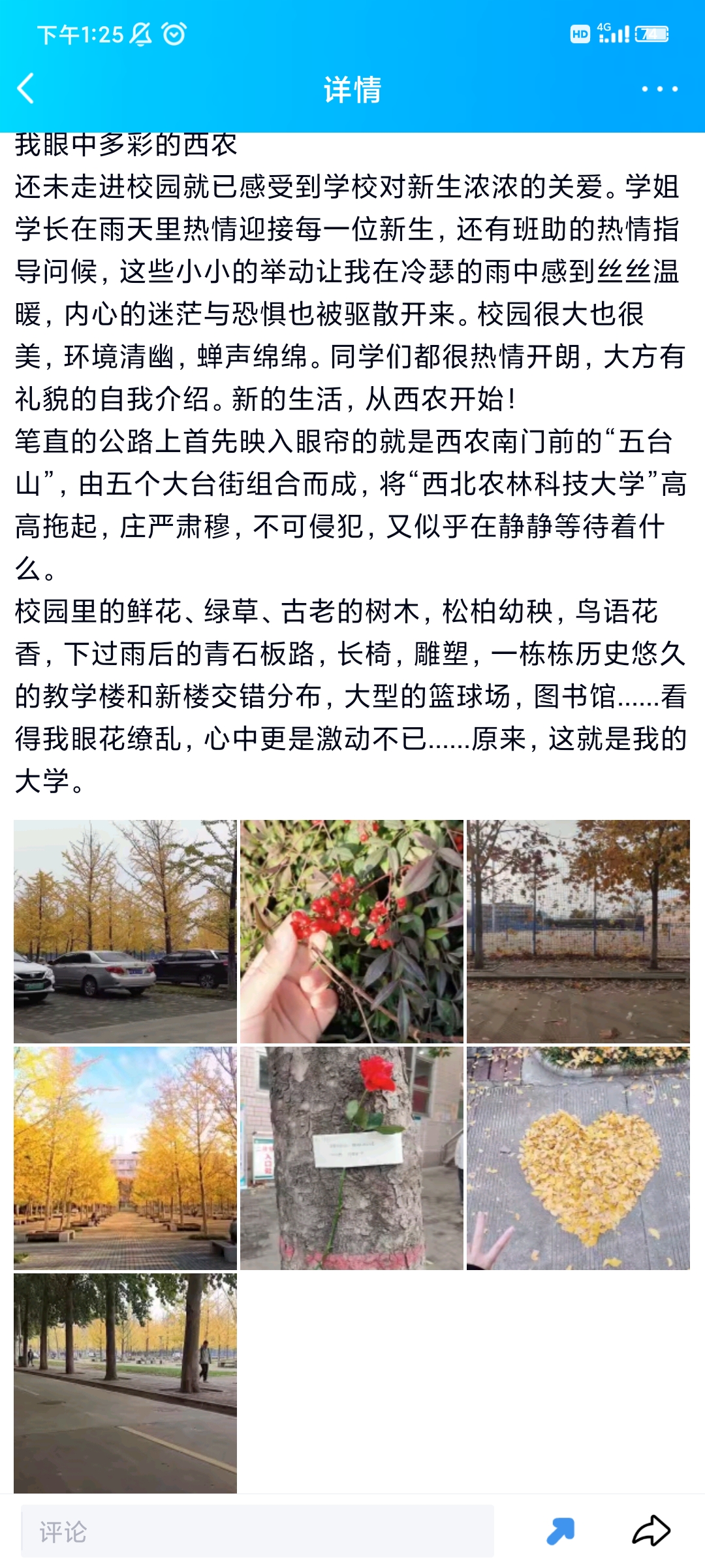 为了帮助小宝探花 新生更加了解熟悉校园,分享自己视角下的校园和初入校园的感受,增强同学们对校园的热爱,同时让在西农一年以上的学生分享自己对小宝探花 的认识,让大家在繁忙的功课之余,走向美丽的校园,感受自然的美,阳光团工委水建支部于2021年11月15日在线上举办了“我眼中的多彩西农”这一为期二十天的活动,下面让我来介绍活动中的一些情况。