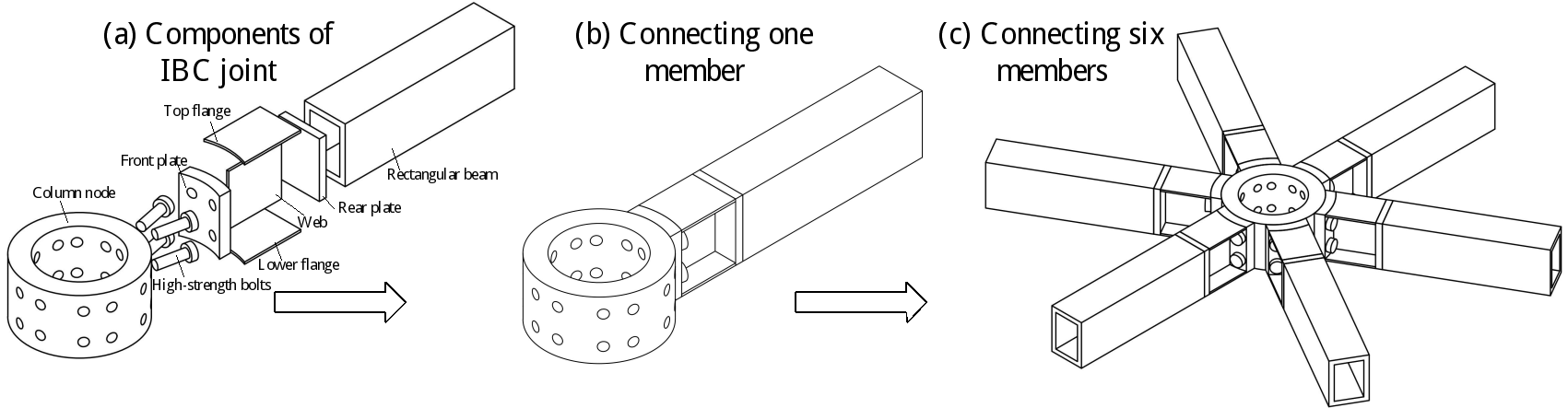 在以往关于半刚接单层网壳的研究中,着重考虑节点偏差或节点强轴抗弯刚度对网壳稳定性的影响,而忽略了其他种类节点刚度及节点大小与节点偏差的耦合作用。基于此,该论文建立了能考虑各种节点刚度和节点尺寸的单层球面网壳(见图1),并通过该模型研究了改进C型(IBC)节点(见图2)各种节点刚度以及节点尺寸和节点偏差对网壳稳定承载能力的影响,并确定了上述因素对网壳力学性能的耦合影响效应。