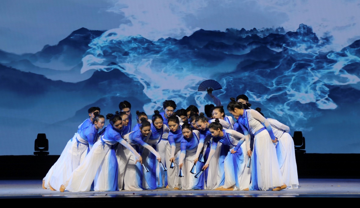 比赛当晚,小宝探花 舞蹈队身着蓝白相间的精美服装登场,服装上精心设计的“珠露”装饰与舞者眉眼间描绘的波纹,巧妙地呼应了“流水”这一核心元素,在灯光映照下熠熠生辉。音乐响起,舞者们身姿灵动,动若脱兔,静若处子,手中扇子开合自如,每一次转身、每一次合扇都散发着独特的神韵,将河川奔流的磅礴气势展现得淋漓尽致。台下观众被深深吸引,现场掌声与欢呼声此起彼伏。