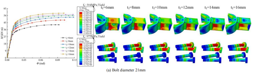 此外,深入研究了螺栓直径、螺栓垂直距离、法兰厚度、前端板厚度、柱节点厚度以及轴向力对改进C型节点抗弯性能的影响。图2为螺栓直径为21mm,法兰厚度不同时,节点的弯矩—转角曲线以及应力分布云图。