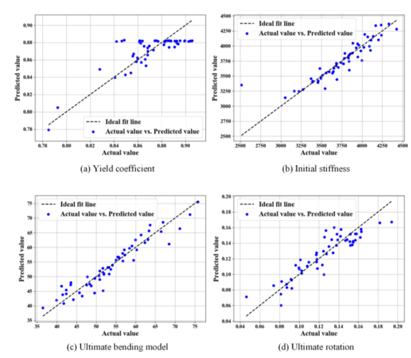 最后,建立了改进C型节点的弯矩-转角双线性模型,对屈服系数、初始抗弯刚度和极限弯矩等关键参数进行拟合,结果表明各参数实际值与预测值偏差很小,拟合效果良好。