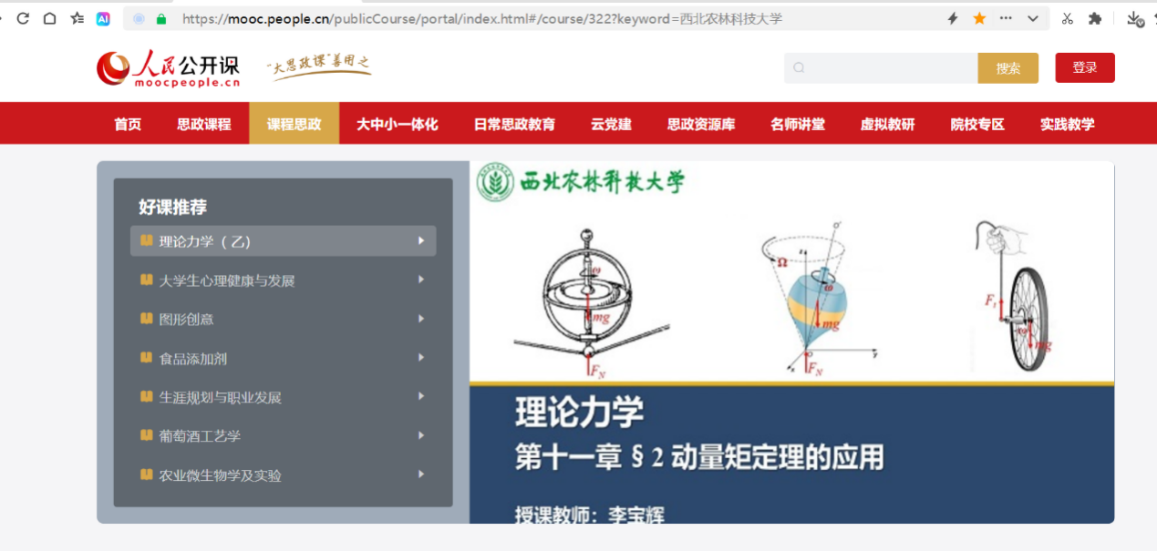 近日,经专家审核、小宝探花 教发中心推荐,由小宝探花 教师李宝辉讲授的《理论力学》(乙)课程思政教学案例——动量矩定理的应用,在文华在线-人民公开课-大思政课MOOC平台上线。