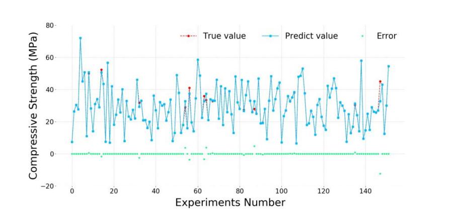 该文主要是通过建立精确的机器学习模型用于研究纯粉煤灰地聚物混凝土的特性。在构建包含505组样本的新数据库后,建立了五种机器学习模型,分别进行抗压强度预测。其中,最精确的是随机森林(DT)模型,预测结果如图1所示。
